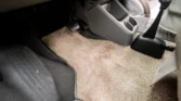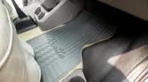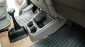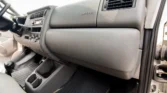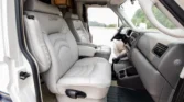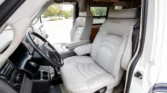 The cab features dual swiveling front seats upholstered in gray leather with adjustable armrests and lumbar support. Rialta-branded rubber floor mats protect beige carpeting, and equipment includes air conditioning, cruise control, a Panasonic CD stereo, and a rooftop switch panel with controls for the rear air conditioning and heat.