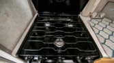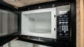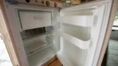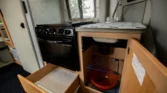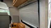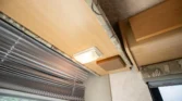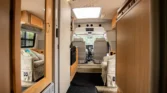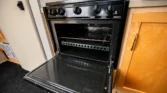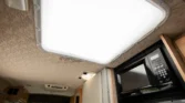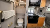 The living space features a swiveling lounge chair across from a kitchenette, which is equipped with a three-burner range, an oven, a microwave, and a sink. An expandable cabinet adjacent to the kitchenette houses a bathroom with a toilet, a collapsible vanity shelf, and a showerhead. Overhead is a translucent bubble-style skylight, a vent for the aforementioned roof-mounted air conditioner, and a bathroom exhaust fan. In the opposite corner of the kitchenette is a refrigerator and additional counter space.