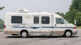This 2003 Winnebago Rialta is finished in white with beige trim, the RV is powered by a 2.8-liter V6 driving the front wheels through a four-speed automatic transaxle. The interior features swiveling front seats upholstered in gray leather along with a lounge chair, a rear dining area that converts to a bed, a bathroom with a shower head, and a kitchenette…